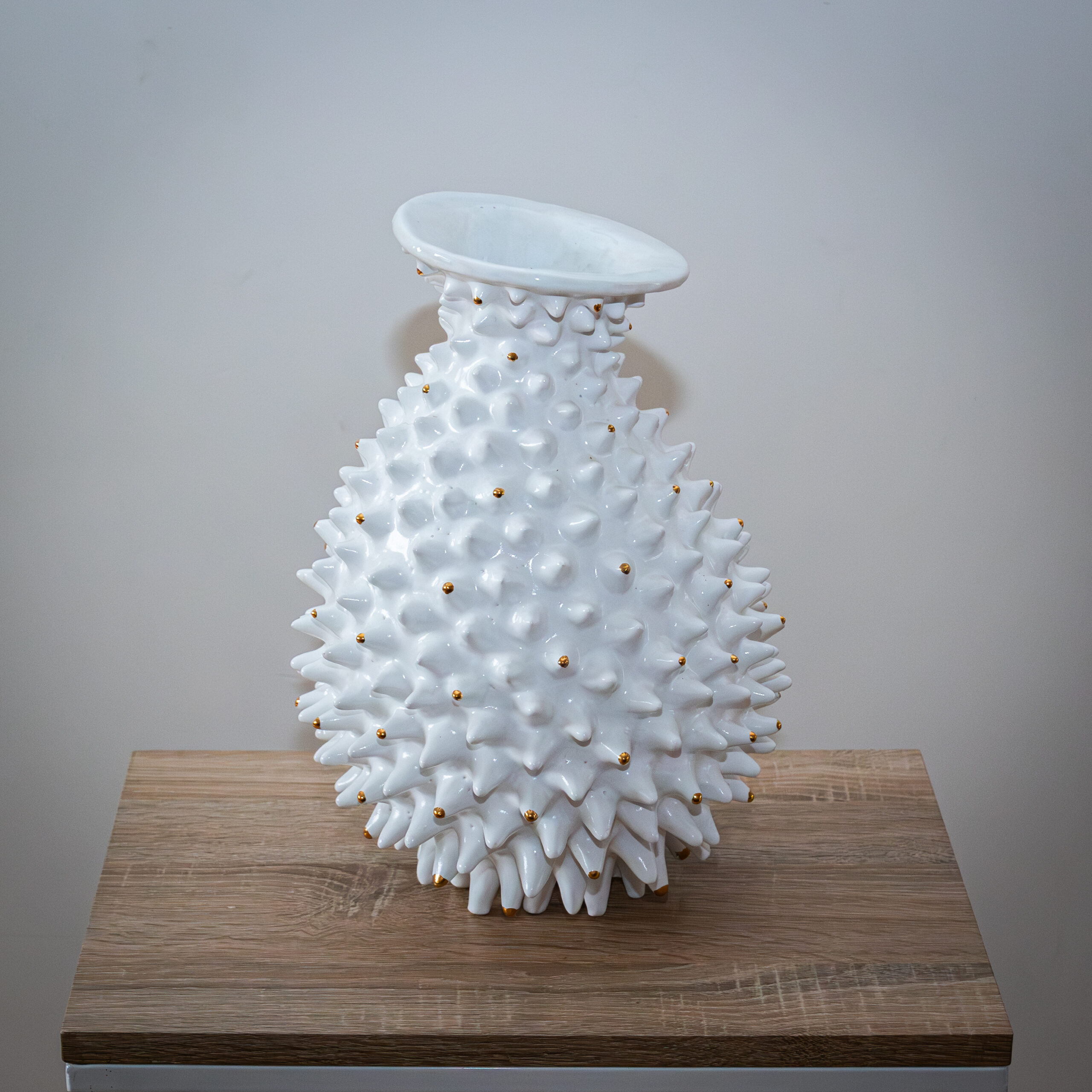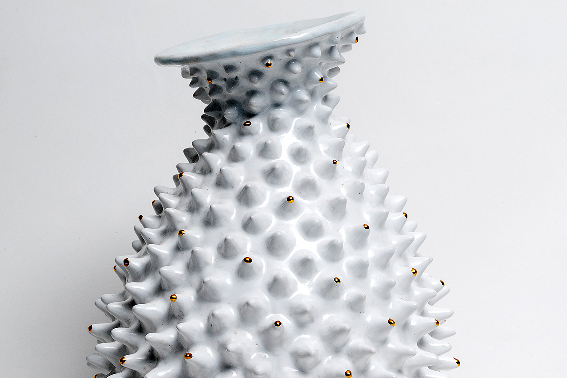 Dat heeft veel invloed gehad, ik kreeg steeds meer lol in al die kleuren en vrijere vormen, mijn eigen bedenksels…Het heeft me vrijer gemaakt. Ik maak graag uitvergrotingen van kleine dingen, snoepjes, madeliefjes in alle maten en vazen waar de bloemen al inzitten. Zo worden het geen gebruiksvoorwerpen maar objecten die zichzelf zijn, en door zo te werken kom ik steeds op nieuwe ideeen.