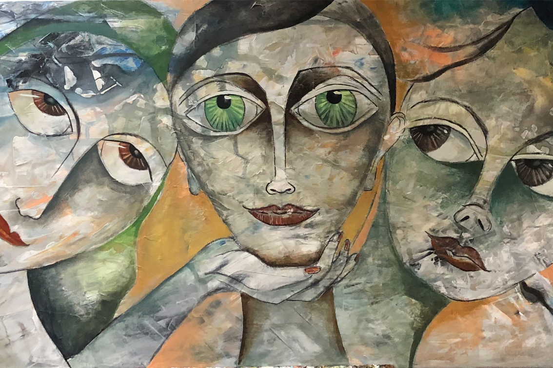 Al mijn fantasie portretten zijn uit hun verband getrokken. Ik maak graag wat grotere monumentale acrylverf schilderijen, soms met bladgoud/inkt erin verwerkt. Ik werk zowel pasteus als verdund.